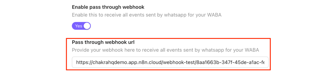 4.3 Now open your Chakra Chat account and go to the WhatsApp Setup page. Then click the more tab. Paste the copied webhook URL into the input box under "pass through webhook URL."